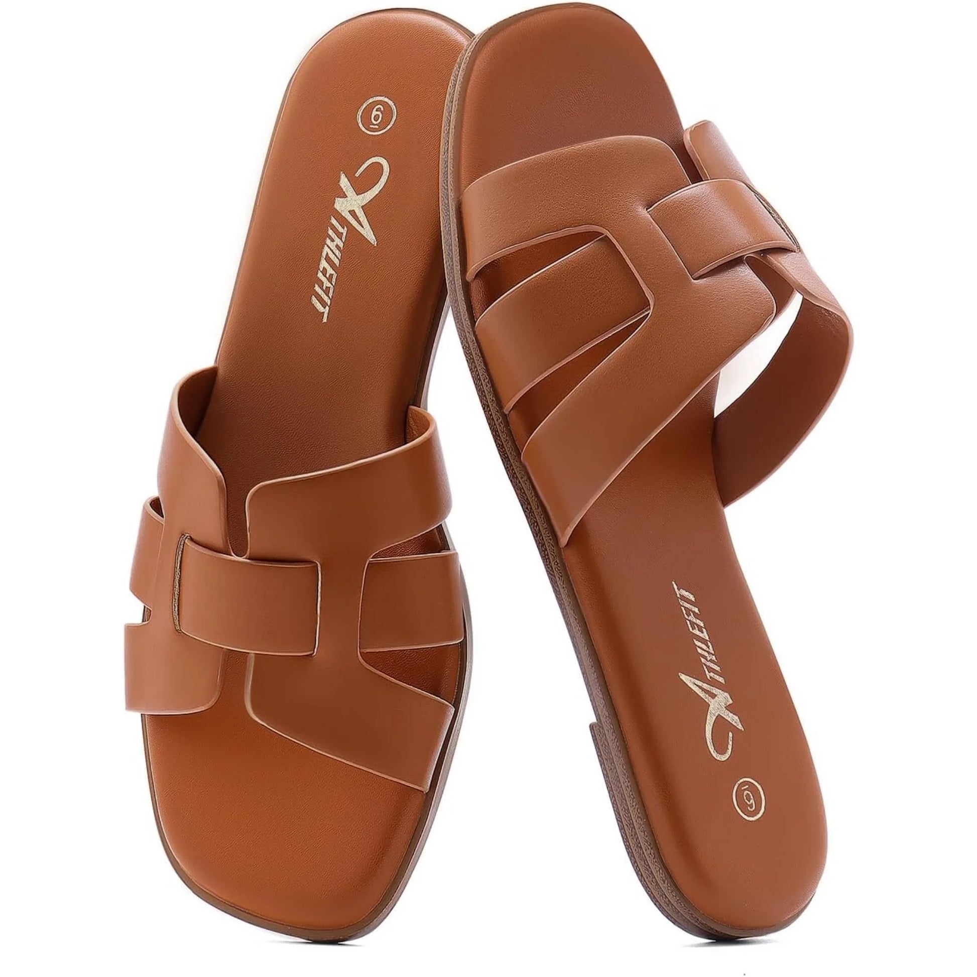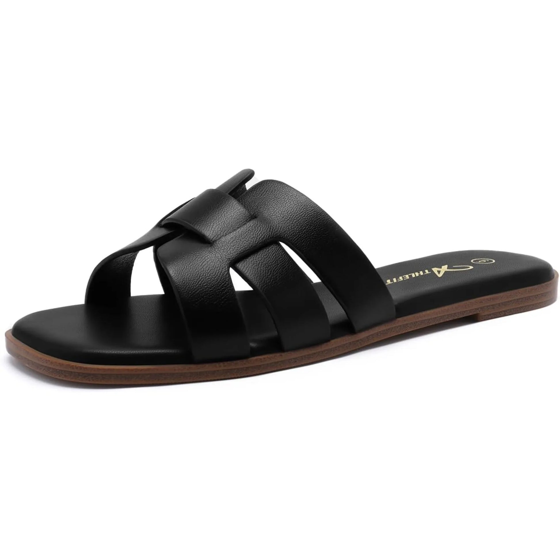 Women's Flat Sandals Dressy Summer Square Open Toe Slip On Leather Slide Sandals